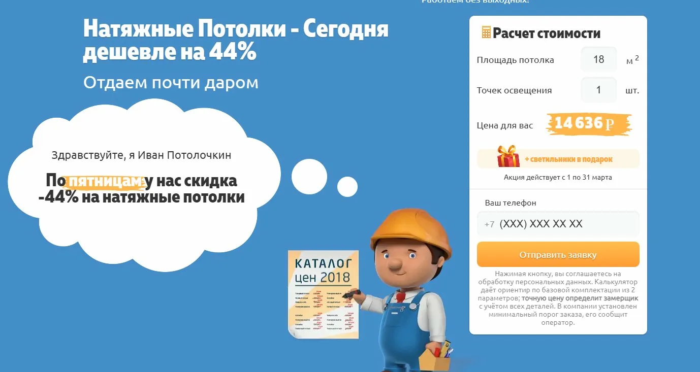Мы вынесли это на первый экран как главный оффер: «По пятницам - потолки дешевле на 44%». Плюс калькулятор с расчётом цены прямо на странице - человек сразу видит конкретную сумму под свою площадь