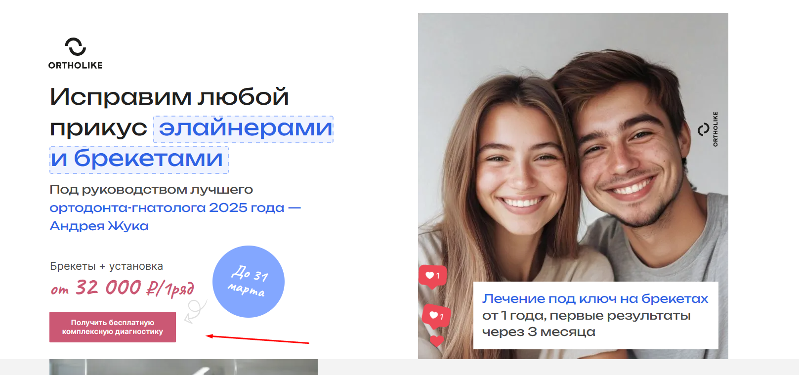Мы добавили рядом кнопку «Получить бесплатную комплексную диагностику». Без формы на пять полей. Просто имя и номер телефона.